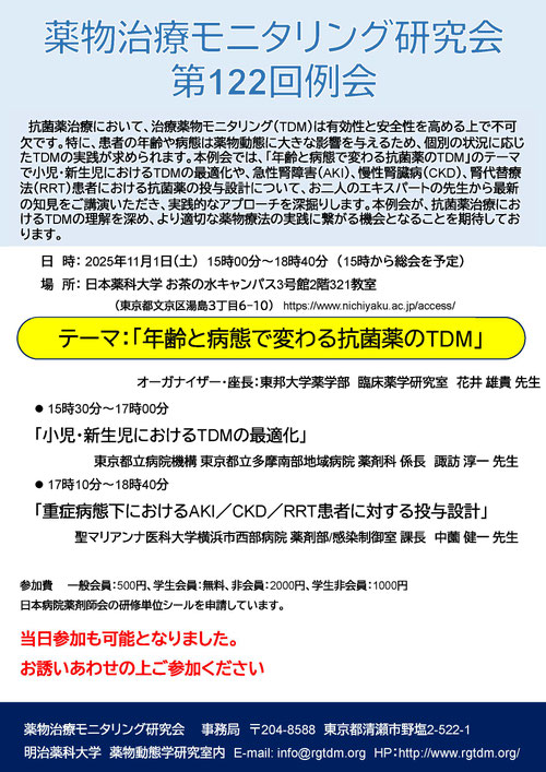 - 「年齢と病態で変わる抗菌薬のTDM」をメインテーマに第122回例会を企画しました。お楽しみにしてください。
